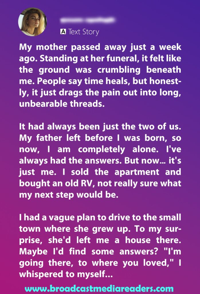 After losing her mother, Emma sets off in an old RV to scatter her ashes in the town her mother once loved. Alone and grieving, she hopes the journey will bring closure. But when her RV breaks down in the middle of nowhere, she’s rescued by a kind man named Oliver and his daughter Grace. Their warmth offers Emma a brief sense of belonging—until a photograph falls from Oliver’s wallet, revealing a woman Emma instantly recognizes: her mother.