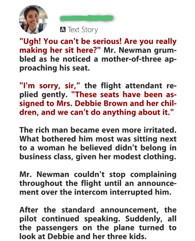 A wealthy businessman scoffed when a mother with three children took the seat beside him. He demanded silence, dismissed her boutique business, and flaunted his million-dollar deal. But as the flight descended, the captain’s voice broke through: “Thank you to my wife Debbie and our kids—your love brought me back to the skies.” The mother’s eyes widened. The captain emerged, knelt before her, and proposed. The cabin erupted in applause. The businessman, once smug, sat speechless. Debbie turned to him and said, “Some of us value love over money. That’s something wealth can’t buy.”