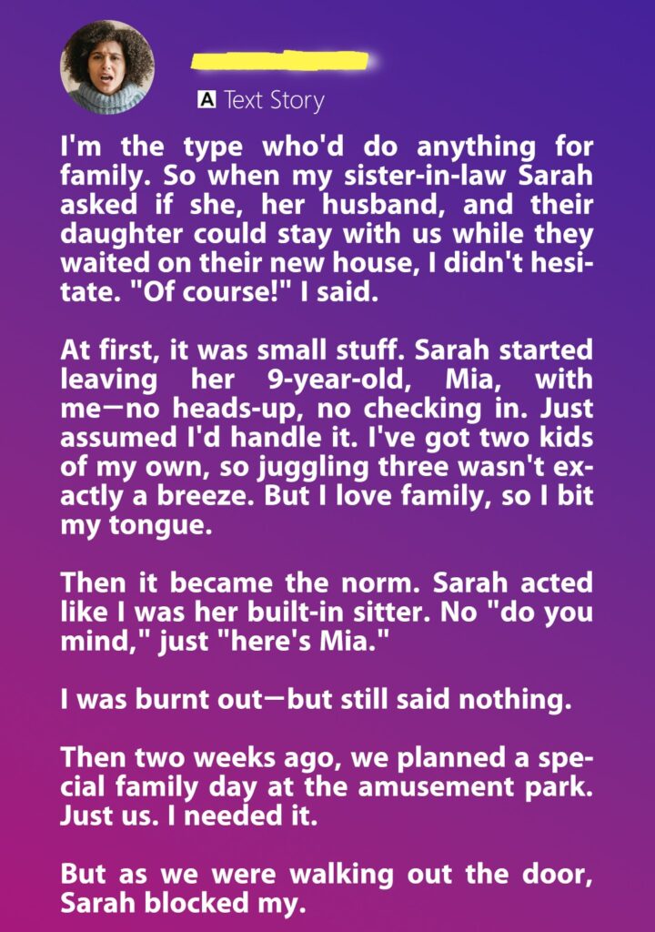 The tipping point came when Sarah guilt-tripped my husband into including Mia in our family outing, only to take her own daughter to a separate amusement park the next day and exclude our kids. That betrayal stung. It wasn’t just about babysitting—it was about respect.