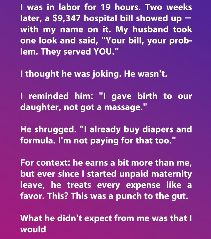 After 19 hours of labor and the joy of welcoming our daughter, I expected support. Instead, I got silence—and a $9,000 hospital bill. My husband John shrugged it off: “Your bill, your problem.” That sentence shattered something in me. Not just trust, but the illusion of partnership.