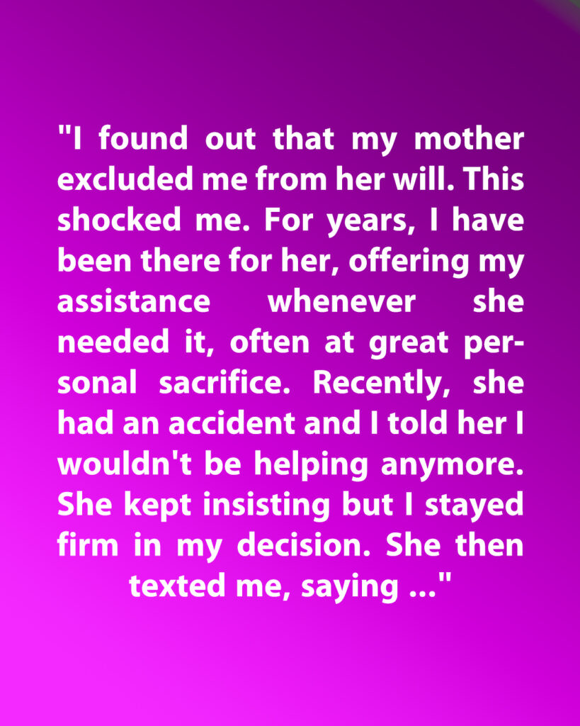 I reread it, heart pounding. Not out of greed—I never wanted her money. But the weight of that rejection crushed me. It wasn’t just about inheritance. It was about being erased. Years of devotion tossed aside with one line of text.