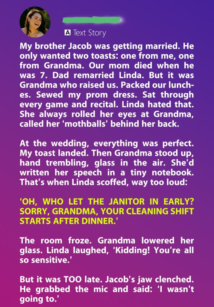 What my stepmom didn’t know was that Grandma had quietly paid for most of the wedding—covering costs when my brother and his fiancée struggled. She never asked for recognition, only respect. And now, publicly humiliated, she stood and left the venue without a word.