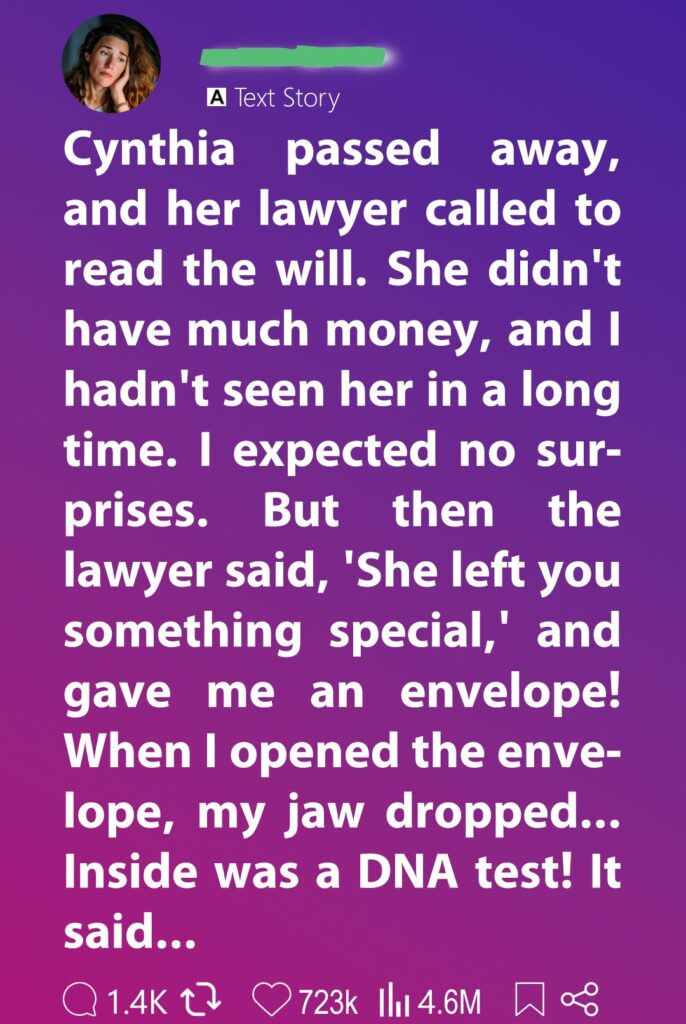 Cynthia was more than my foster sister—she was my anchor during a childhood marked by silence and secrets. We drifted apart over the years, but when she passed unexpectedly, I was stunned to learn she’d named me in her will. What she left behind wasn’t money or heirlooms—it was a sealed letter and a DNA test.