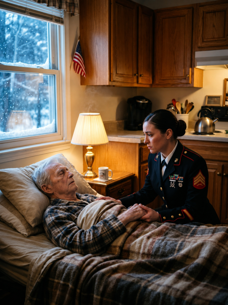 Grandpa sitting in his recliner, smiling too hard, a blanket over his knees. My father standing behind him with one hand on his shoulder. I had looked at that photo from my barracks and felt homesick.