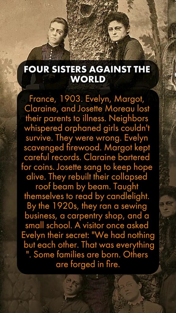 France, 1903. Evelyn, Margot, Claraine, and Josette Moreau lost their parents to illness. Neighbors whispered orphaned girls couldn’t survive. They were wrong. Evelyn scavenged firewood. Margot kept careful records. Claraine bartered for coins. Josette sang to keep hope alive. They rebuilt their collapsed roof beam by beam. Taught themselves to read by candlelight. By the 1920s, they ran a sewing business, a carpentry shop, and a small school. A visitor once asked Evelyn their secret: “We had nothing but each other. That was everything.” Some families are born. Others are forged in fire.
