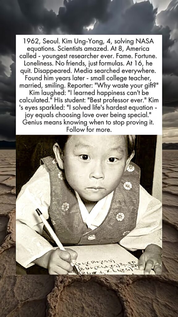 1962, Seoul. Kim Ung-Yong, 4, solving NASA equations. Scientists amazed. At 8, America called — youngest researcher ever. Fame. Fortune. Loneliness. No friends, just formulas. At 16, he quit. Disappeared. Media searched everywhere. Found him years later — small college teacher, married, smiling. Reporter: “Why waste your gift?” Kim laughed: “I learned happiness can’t be calculated.” His student: “Best professor ever.” Kim’s eyes sparkled: “I solved life’s hardest equation — joy equals choosing love over being special.” Genius means knowing when to stop proving it. Follow for more.