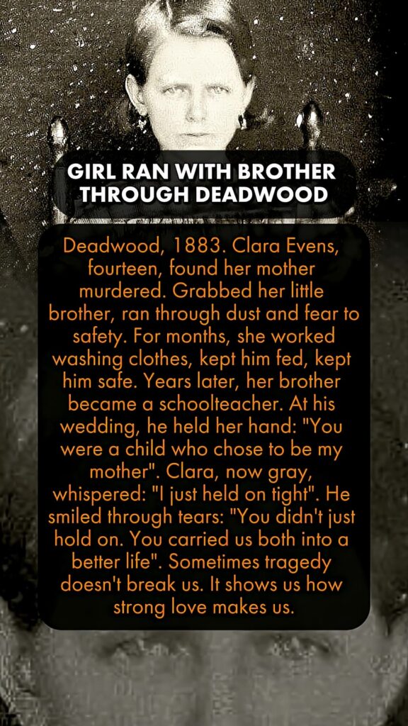 Deadwood, 1883. Clara Evens, fourteen, found her mother murdered. Grabbed her little brother, ran through dust and fear to safety. For months, she worked washing clothes, kept him fed, kept him safe. Years later, her brother became a schoolteacher. At his wedding, he held her hand: “You were a child who chose to be my mother.” Clara, now gray, whispered: “I just held on tight.” He smiled through tears: “You didn’t just hold on. You carried us both into a better life.” Sometimes tragedy doesn’t break us. It shows us how strong love makes us.